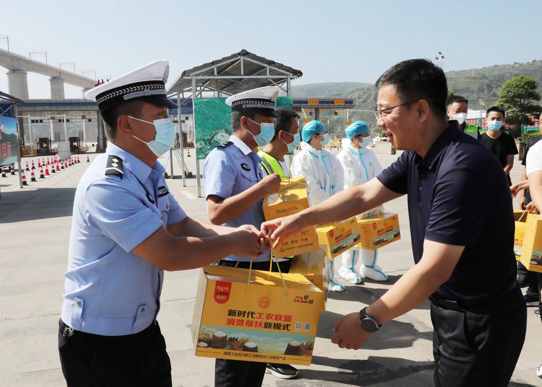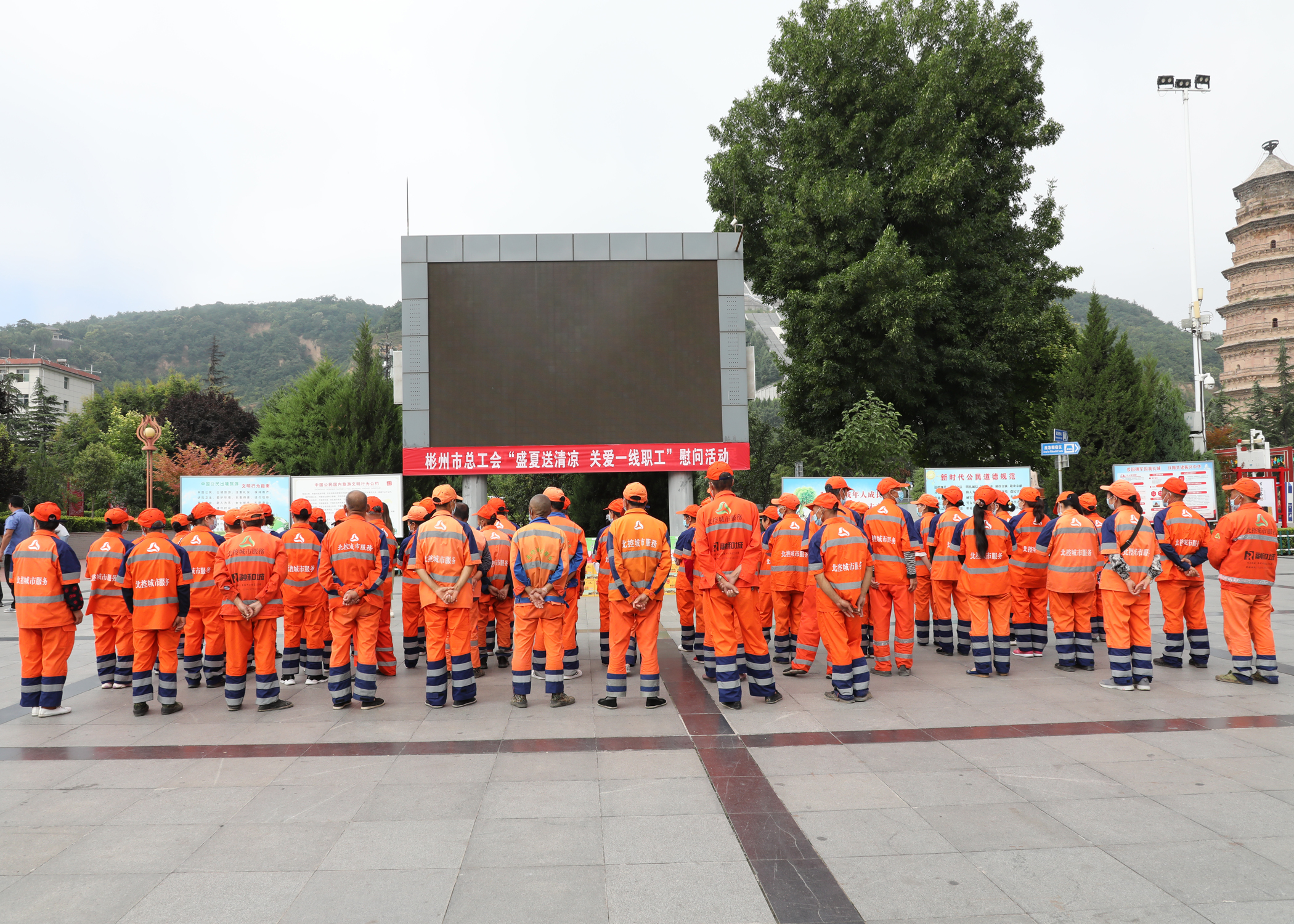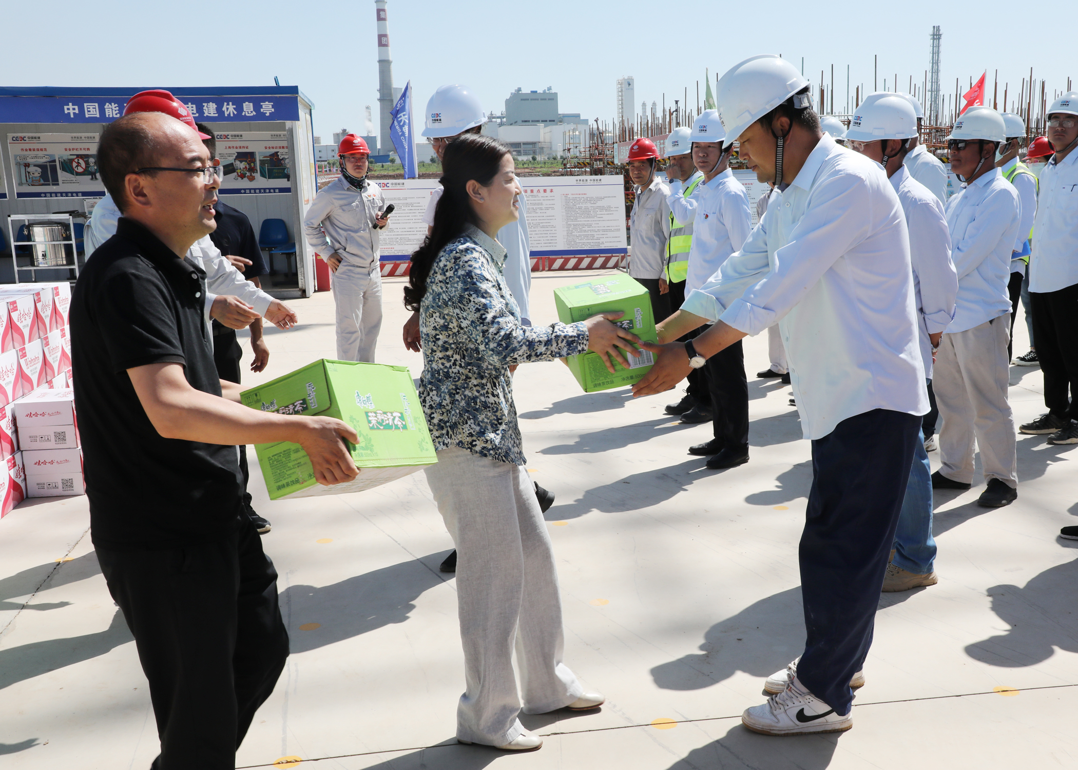 彬州市委副書記任挺,市人大副主任、市總工會主席徐亞莉等領導先后來到開元廣場、高速出入口、“四比一建”660兆瓦發電項目工地為環衛工人、一線防疫人員、高溫室外勞動者等一線職工送去礦泉水、綠茶、送清涼大禮包等防暑降溫用品。
